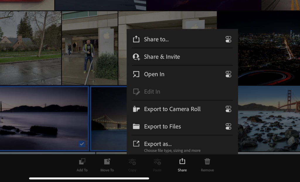 Kompletně přepracovaný byl i export. V první řadě v menu Share přibyla položka Export as…, která umožňuje plně nastavit parametry exportu. Nastavit konečně lze libovolné rozlišení, formát JPG, TIF nebo DNG, komprese JPEG formátu, 8/16bit verzi TIFu a jeho kompresi, barevný prostor doostření, přejmenování, přidání vodoznaku a práci s metadaty. U položek Share to…, Open In…, Export to camera roll a Export to Files máte dvě možnosti. Buď kliknete na jméno položky a proběhne export se stejným nastavením jako posledně. Nebo kliknete na ikonu nastavení a můžete ručně nastavit parametry stejně jako v případě Export as.